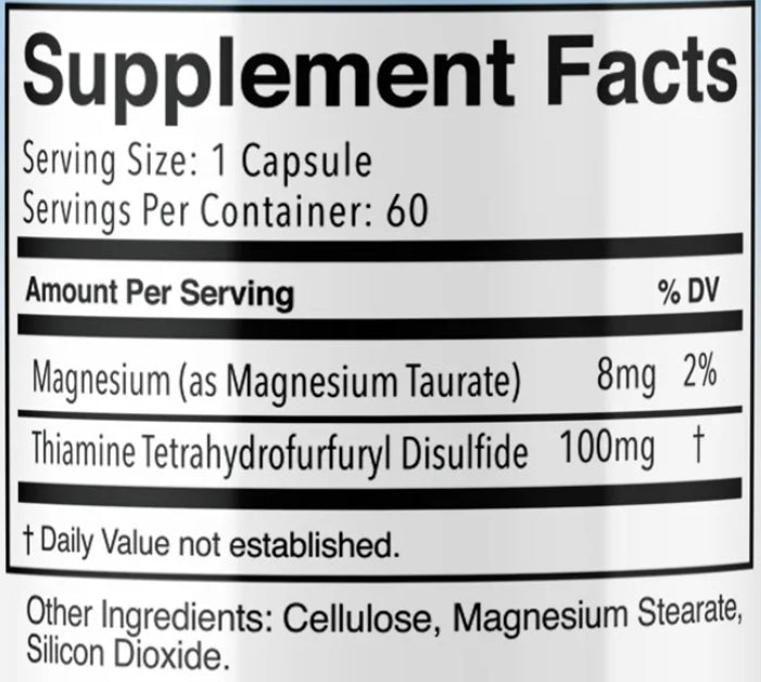TTFD B1 Max는 일반 비타민 B1(티아민)보다 흡수율이 훨씬 높은 특수 형태의 활성형 비타민 B1(Thiamine Tetrahydrofurfuryl Disulfide, TTFD)을 100 mg 함유하고 있으며, 일본을 중심으로 활발히 연구된 성분입니다 또한, 세포 내 효율적인 활용을 돕기 위해 소량의 마그네슘(타우레이트 형태)이 함께 포함되어 있습니다 .